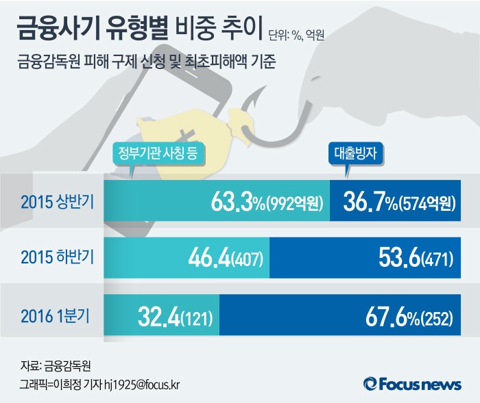 금감원에 따르면 올해 1분기 금융사기 피해액은 373억원이었고 이 가운데 대출사기 피해액은 252억원으로 전체의 67.6%를 차지했다.