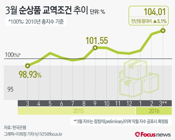 25일 한국은행이 발표한 ‘3월 무역지수 및 교역조건’을 보면 지난달 순상품교역조건지수는 104.01로 전년 동월 대비 5.1% 상승했다.