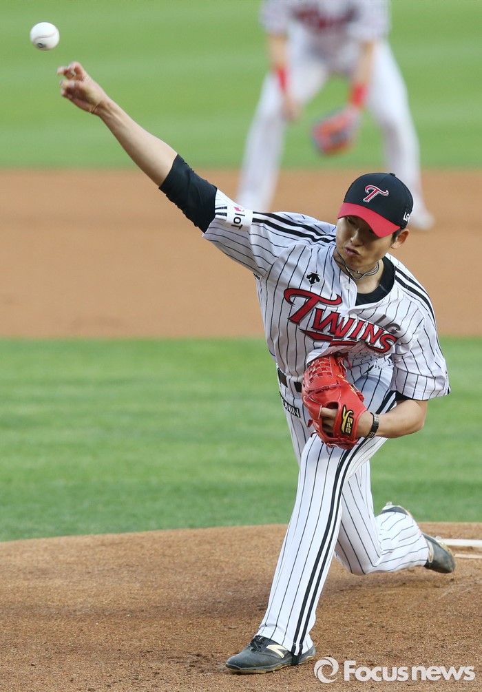 (서울=포커스뉴스) 29일 서울 잠실구장에서 열린 2016 프로야구 kt-LG 경기에서 1회초 LG 선발투수 이준형이 투구하고 있다.