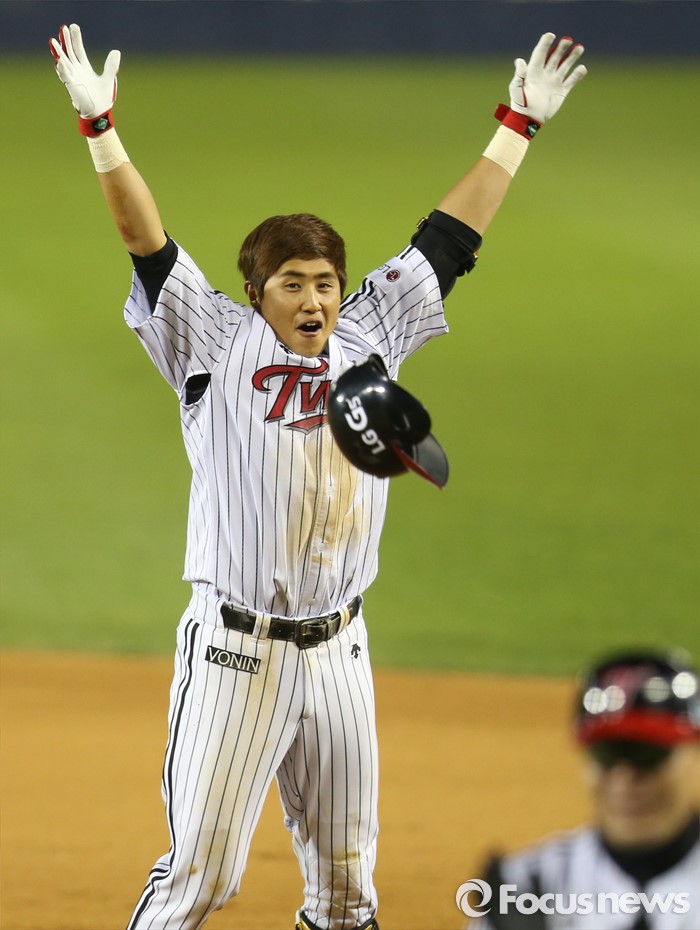 (서울=포커스뉴스) 29일 서울 잠실구장에서 열린 2016 프로야구 kt-LG 경기 9회말 1사 만루에서 LG 채은성이 끝내기 우전안타를 치고 1루에서 환호하고 있다.