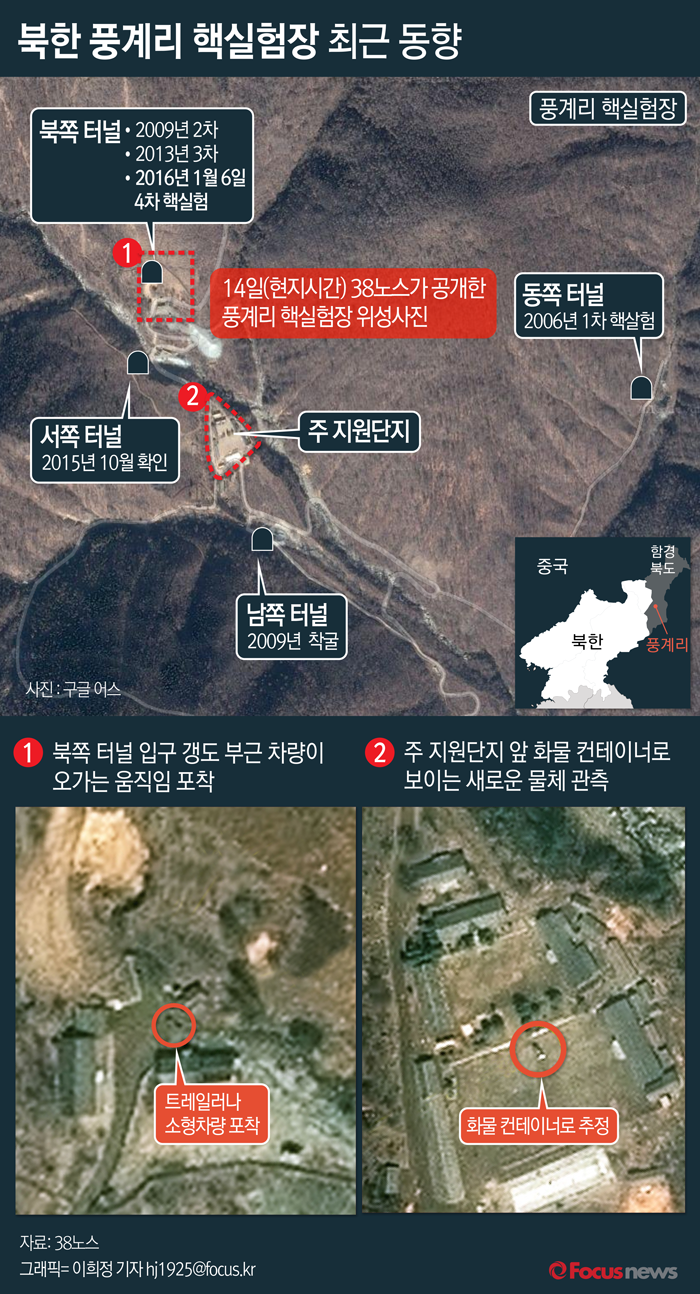 또 미국의 북한전문매체 <38노스>는 이달 초부터 "북한 풍계리 핵심험장 갱도와 일부 시설 등에서 차량의 움직임이 활발해졌고, 핵실험을 준비하는 정황들이 포착되고 있다"며 5차 핵실험 가능성을 높아지고 있다고 분석했다.(서울=포커스뉴스) 38노스에 따르면 지난 14일 북한 함경북도 풍계리 핵실험장의 북쪽 터널 갱도입구 부근을 촬영한 위성사진에 차량용 트레일러 또는 소형 차량으로 추정되는 소형 물체가 포착됐으며 주 지원 단지에서는 선적 컨테이너나 장비 트레일러로 추정되는 물체가 포착됐다. 2016.04.19 이희정 기자