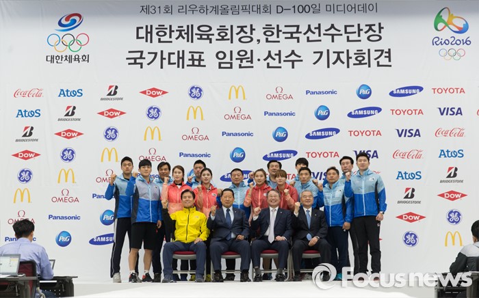 (서울=포커스뉴스) 27일 오후 서울 노원구 태릉선수촌에서 제31회 리우하계올림픽대회 D-100일 미디어데이에 참석한 대한체육회장과 선수단장, 선수들이 파이팅을 외치며 기념촬영을 하고 있다.