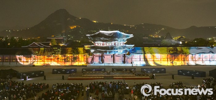 (서울=포커스뉴스) 29일 저녁 서울 경복궁 흥례문 광장에서 열린 제 2회 궁중문화축전 개막제에서 경복궁의 역사를 빛으로 담아낸 '미디어 파사드' 공연이 시선을 사로잡고 있다. '오늘, 궁을 만나다'를 주제로 열리는 2016년 궁중문화축전은 다채로운 프로그램들과 함께 5월 8일까지 열린다.