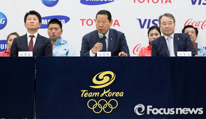 (서울=포커스뉴스) 27일 오후 서울 노원구 태릉선수촌에서 제31회 리우하계올림픽대회 D-100일 미디어데이에 참석한 김정행(가운데) 대한체육회장이 인사말을 하고 있다. 왼쪽부터 정몽규 선수단장, 김 회장, 강영중 대한체육회장.