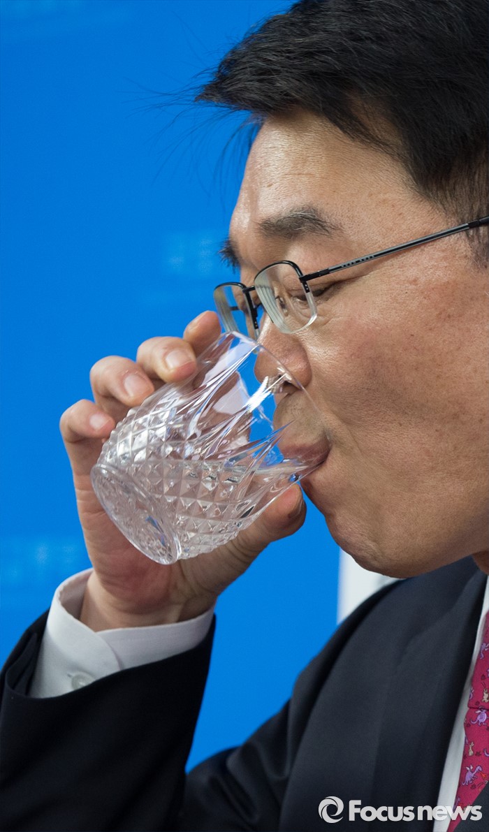 (세종=포커스뉴스) 강호인 국토교통부장관이 27일 오후 세종시 정부세종청사 국토부 기자실에서 맞춤형 주거지원을 통한 주거비 경감 방안 발표 중 목을 축이고 있다.
