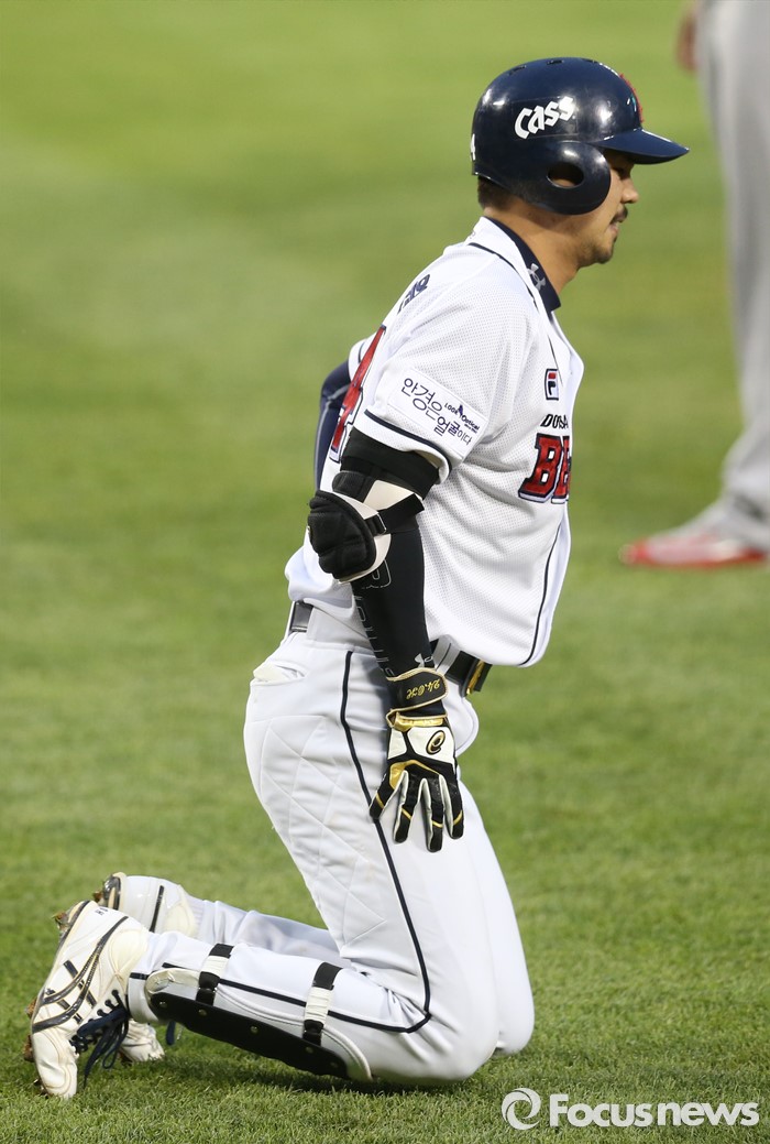 (서울=포커스뉴스) 26일 서울 잠실구장에서 열린 2016 프로야구 SK-두산 경기 2회말 1사 1루에서 두산 오재원이 SK 투수 켈리의 투구에 오른쪽 발을 맞고 진루하기 위해 일어나고 있다.