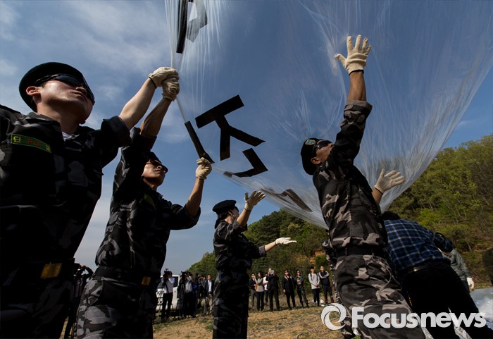 (파주=포커스뉴스) 29일 오후 경기 파주 낙하IC 인근에서 탈북자단체인 자유북한운동연합이 북한에 핵과 미사일을 포기하고 국제사회 일원으로 참여할 것을 촉구하는 내용의 대북전단을 날려보내기 위해 수소가스를 주입하고 있다.