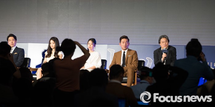 (서울=포커스뉴스) 2일 오전 서울 중구 웨스틴조선호텔에서 열린 영화 '아가씨' 제작보고회에 참석한 영화감독 박찬욱(앞죽 오른쪽)이 인사말을 하고 있다. 앞줄 왼쪽부터 배우 조진웅, 김태리, 김민희, 하정우, 박찬욱.