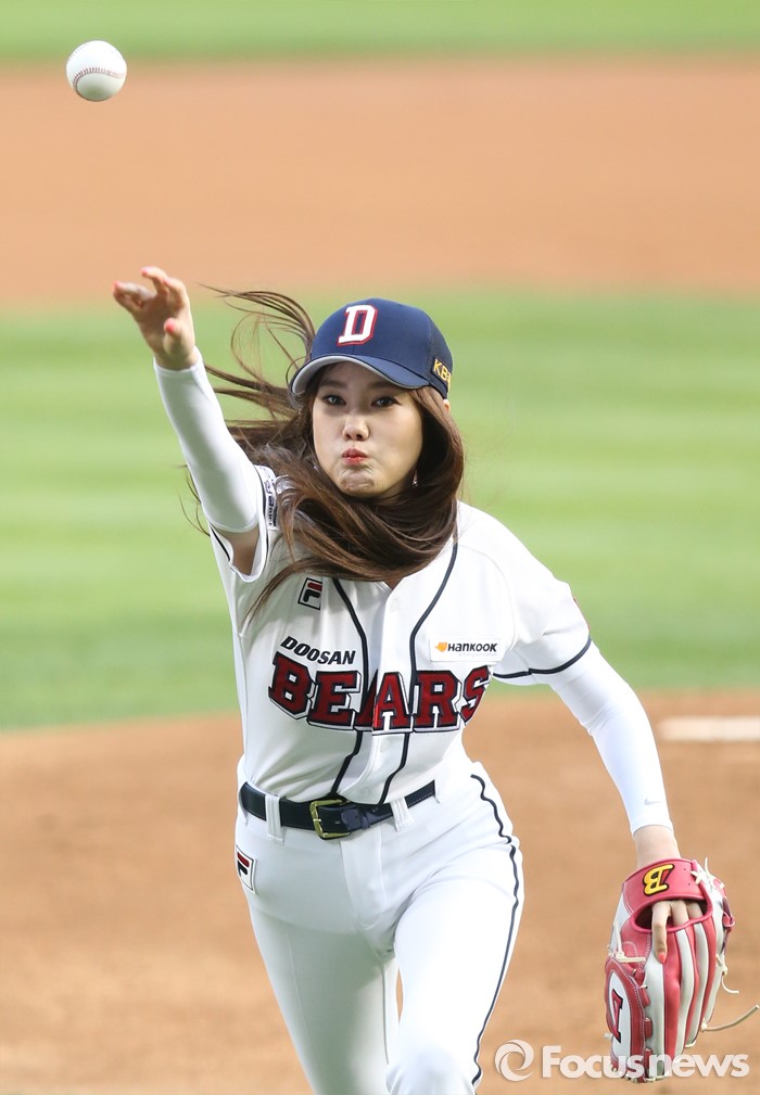 (서울=포커스뉴스) 28일 서울 잠실구장에서 열린 2016 프로야구 SK-두산 경기에 앞서 가수 김현정이 시구하고 있다.