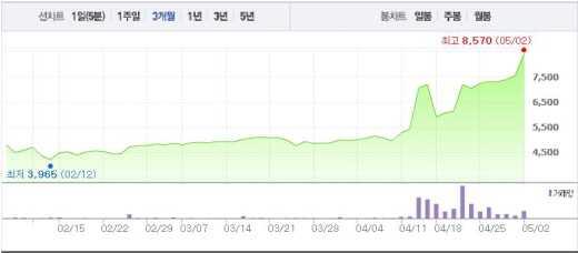 한편, 국민일보가 4월 24일 여론조사기관인 지앤컴리서치에 의뢰해 발표한 결과에 따르면 19대 대선 새누리당 후보 적합도 조사에서 반 총장은 38.0%를 기록, 첫 1위를 차지했다.주가흐름<사진출처=네이버 캡쳐>