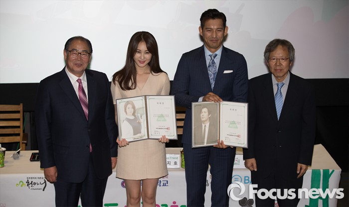 (서울=포커스뉴스) 26일 오전 서울 동작구 아트나인에서 열린 '제4회 무주산골 영화제' 기자간담회에 참석한 황정수(왼쪽부터) 조직위원장, 배우 손은서, 오지호, 유기하 집행위원장이 포토타임을 갖고 있다.