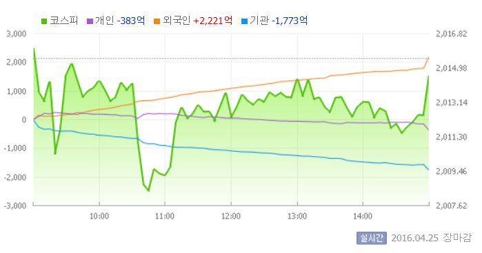 이날 코스피는 전일대비 0.03% 상승한 2016.05로 장을 시작했다. 그러나 지수는 기관의 팔자세에 장중 한때 2010선이 무너지기도 했다.