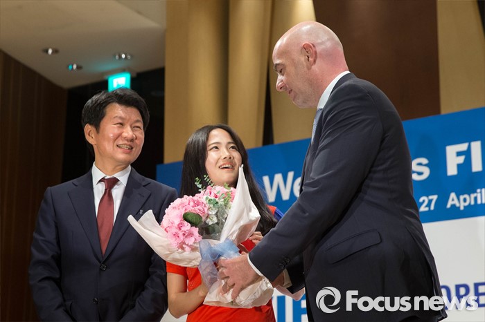 (서울=포커스뉴스) 한국을 방문한 지아니 인판티노(46, 스위스) FIFA 회장이 27일 오후 서울 강남구 아이파크타워에서 열린 기자회견에 참석, 축구유망주 이민아 선수로부터 꽃다발을 전달받고 있다.