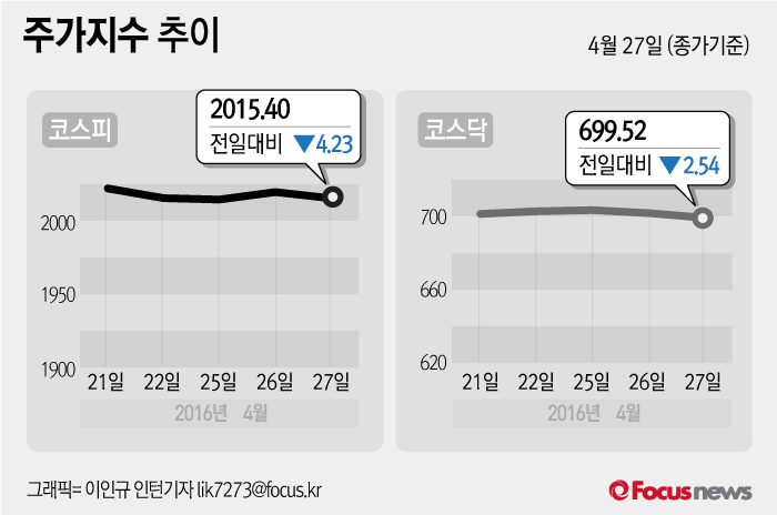 (서울=포커스뉴스) 27일 코스피지수는 전날 보다 0.21%(4.23포인트) 내린 2015.40에 장을 마쳤다. 코스닥지수는 전일 대비 0.36%(2.54포인트) 내린 699.52에 마감했다.