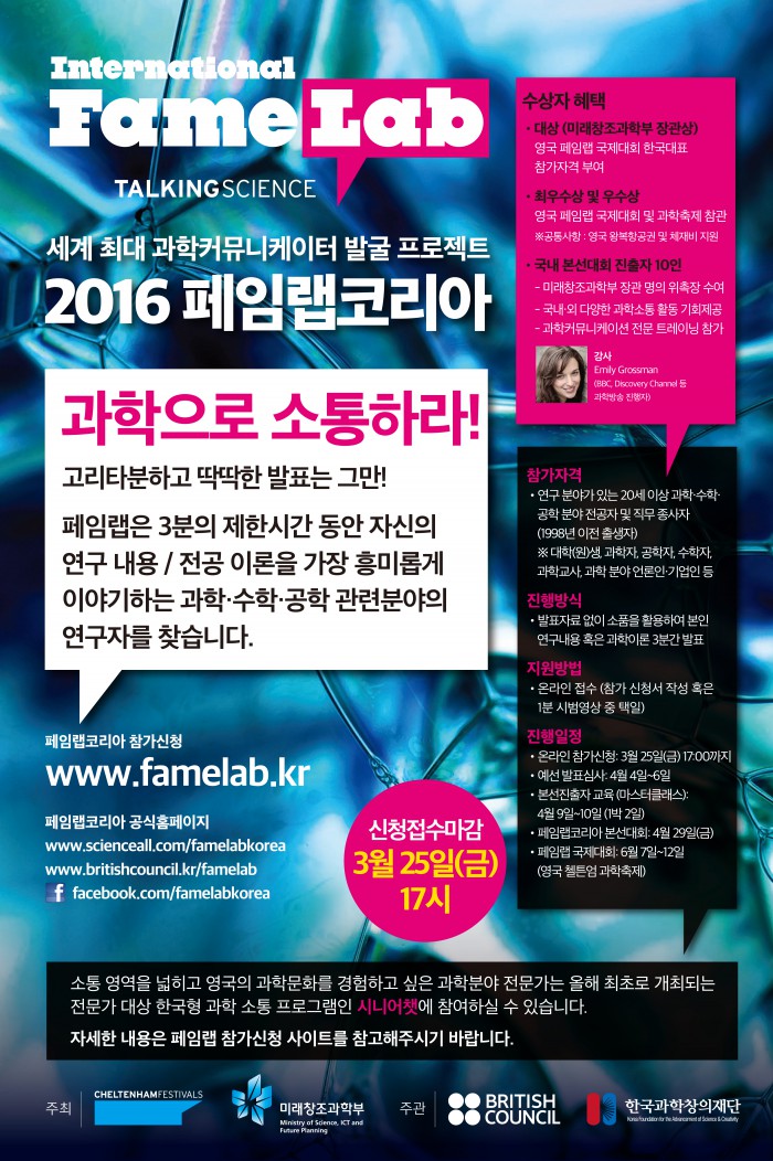 최양희 미래창조과학부 장관은 “과학기술 50년을 맞아, 페임랩 코리아와 같은 창의적인 과학 소통 대회를 통해 과학소통이 더욱 활발해지고 과학에 친화적인 사회 분위기가 조성되기를 기대한다”고 말했다.페임랩 코리아 포스터.<사진=페임랩코리아 홈페이지>