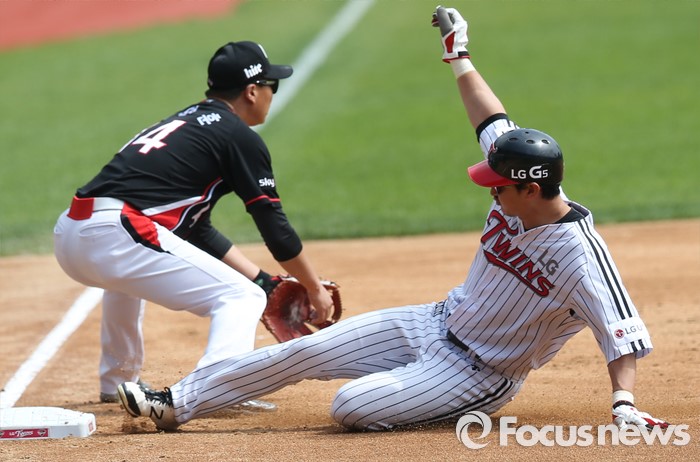 | △ 3루에서 세이프되는 박용택 |