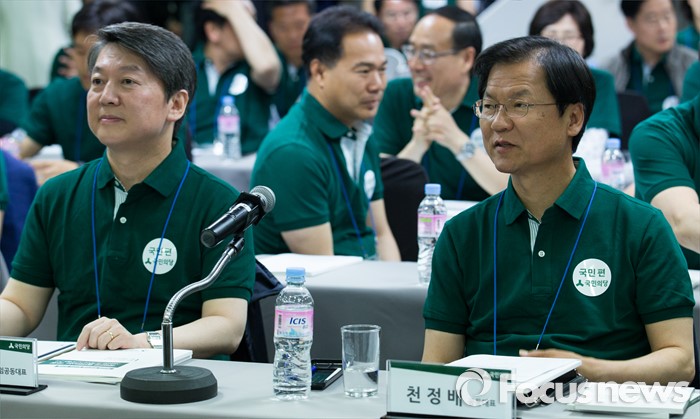 (양평=포커스뉴스) 안철수(왼쪽) 국민의당 상임공동대표와 천정배 공동대표가 26일 오후 경기도 양평 한화리조트에서 열린 20대 총선 당선인 워크숍에 참석하고 있다.