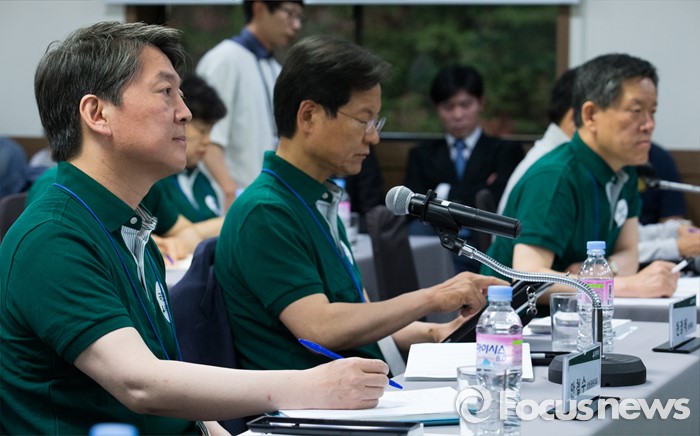 (양평=포커스뉴스) 안철수(왼쪽부터) 국민의당 상임공동대표와 천정배 공동대표, 주승용 원내대표가 26일 오후 경기도 양평 한화리조트에서 열린 20대 총선 당선인 워크숍에 참석해 김병준 전 대통령 정책실장의 강연을 경청하고 있다.