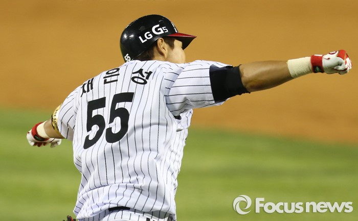 (서울=포커스뉴스) 29일 서울 잠실구장에서 열린 2016 프로야구 kt-LG 경기 9회말 1사 만루에서 LG 채은성이 끝내기 우전안타를 치고 환호하며 1루로 뛰어 나가고 있다.