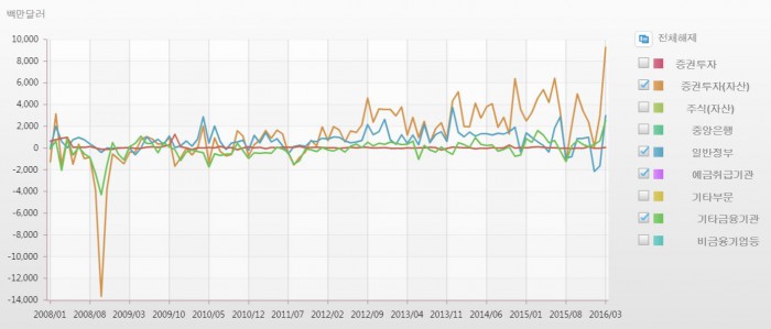 2일 한국은행이 낸 '2016년 3월 국제수지 잠정치' 자료에 따르면 금융계정 중 증권투자(자산부문) 증가액은 92억7000만달러를 기록했다. 전월 증가액 29억4000만달러에 비해 215%(63억3000만달러)가 늘어났으며, 1980년 국제수지 통계 재편 이후 최대 증가치다.
