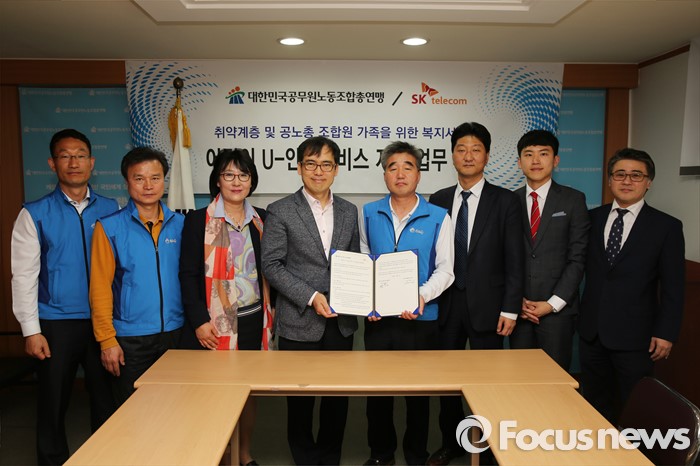 (서울=포커스뉴스) 대한민국공무원노동조합총연맹(위원장 류영록)이 2일 서울 용산구 공노총 회의실에서 SK텔레콤과 ‘어린이 U-안심서비스 지원 MOU'를 체결 맺고 기념촬영을 하고 있다. <사진제공=대한민국공무원노동조합총연맹>