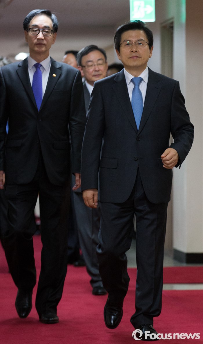 (서울=포커스뉴스) 황교안(오른쪽) 국무총리와 이준식 사회부총리 겸 교육부장관이 3일 오전 서울 종로구 정부서울청사에서 열린 국무회의에 자리하기 위해 회의실로 입장하고 있다.
