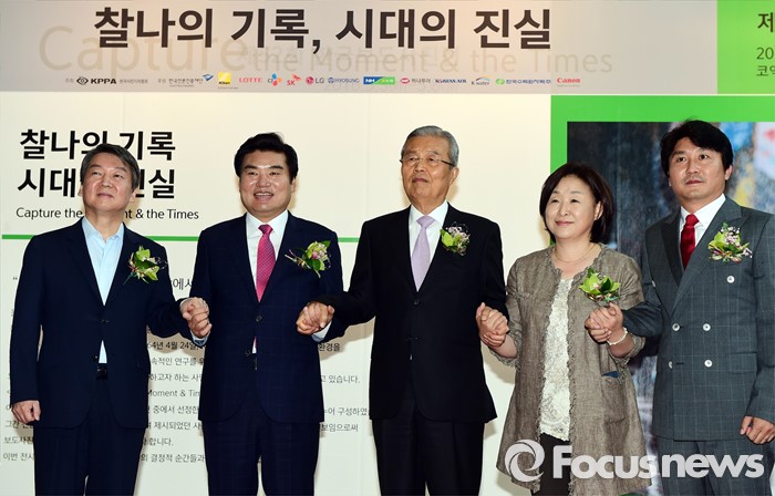 (서울=포커스뉴스) 3일 오전 서울 강남구 코엑스에서 열린 '52회 한국보도사진전 개막식'에 참석한 안철수(왼쪽부터) 국민의당 상임공동대표, 원유철 새누리당 대표최고위원 권한대행, 김종인 더불어민주당 비대위 대표, 심상정 정의당 상임대표, 이동희 한국사진기자협회장이 손을 잡고 포즈를 취하고 있다. '찰나의 기록, 시대의 진실'을 주제로 진행된 이번 전시는 시대의 진실을 기록한다는 사명감으로 역사의 현장을 묵묵히 지키며 취재한 수백만 컷 중 선정된 150여점과 '현장의 사진기자', '역대 대상 수상작' 등 250여점의 사진이 전시된다.