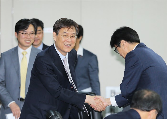 (서울=포커스뉴스) 이관섭 산업통상자원부 1차관이 3일 오후 서울 무역보험공사 대회의실에서 열린 제2차 수출지원기관협의회에 참석해 참석자들과 악수를 하고 있다.