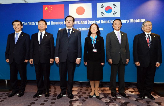 역내 채권시장 발전과 저축이 투자로 환류되는 선순환 구조를 세우기 위해 새로운 아시아채권시장발전방안(ABMI) 중기 로드맵도 승인했다.(서울=포커스뉴스) ADB연차 총회 참석차 독일 프랑크푸르트를 방문 중인 유일호 부총리 겸 기획재정부 장관이 5월 3일(현지시간) 메리어트호텔에서 열린 제16차 한·중·일 재무장관회의에 참석하여, 기념촬영을 하고 있다. 왼쪽부터이주열 한은총재, 유일호 부총리, 러우지웨이 중국재무장관. <사진제공=기획재정부> 2016.05.03 포커스포토