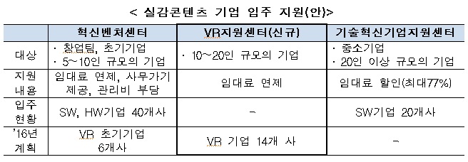 이번 간담회에서 미래부는 상암 DMC에 중소 VR업체 지원을 위해 1500평 규모의 성장지원센터를 마련하고, 14개 유망기업을 선발해 임대료를 면제하겠다고 밝혔다.
