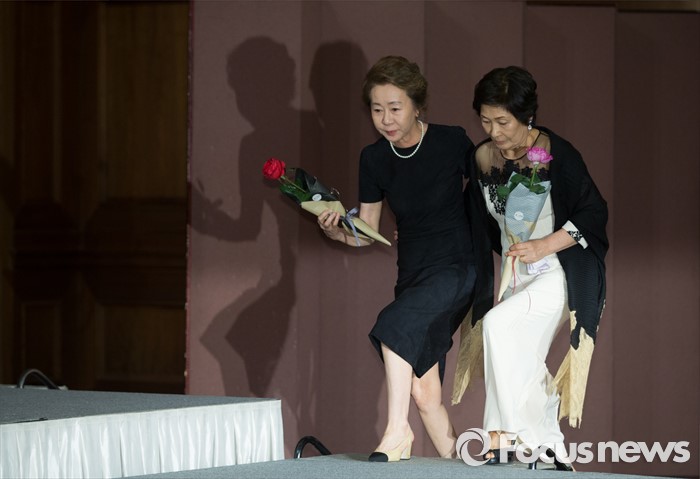 (서울=포커스뉴스) 4일 오후 서울 강남구 임피리얼 팰리스 호텔에서 열린 tvN 10주년 특별기획 '디어 마이 프렌즈' 제작발표회에 참석한 배우 윤여정(왼쪽)과 김혜자가 포토타임을 위해 이동하고 있다.