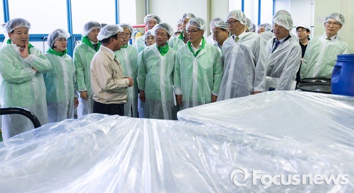 (인천=포커스뉴스) 박지원 국민의당 원내대표를 비롯한 20대 총선 당선인들이 4일 오후 인천 남동구 (주)서울화장품 인천공장에서 열린 국민의당 정책역량강화 집중 워크샵 '중소기업 대표 및 근로자와의 간담회'에서 화장품 제조 라인을 둘러보고 있다.