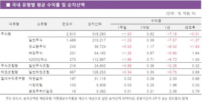 [주간펀드시황] 국내주식펀드, 증시 약세에 한주간 1.50%↓