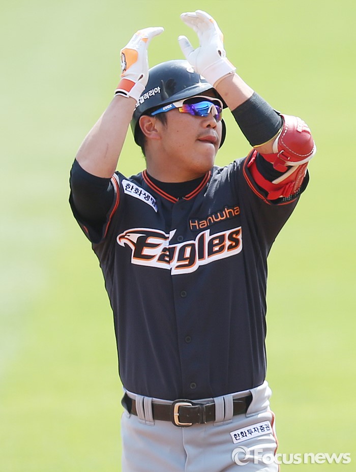 (서울=포커스뉴스) 8일 수원 kt위즈파크에서 열린 2016프로야구 한화-kt 경기 2회초 2사 2루에서 한화 정근우가 좌전 안타로 2루주자를 불러 들이는 선취 타점을 올리고 수비의 허점을 틈타 2루까지 진루한 후 박수치고 있다.