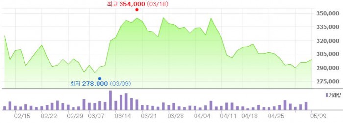 그는 "참치어가가 1500~1600달러에서 유지되면 동원F&B는 참치캔 가격 인상과 마케팅 축소로 대응할 것"이라며 "참치캔 가격을 5~6% 인상하면 매출 150억원, 영업이익 100억원 증가로 원가 상승의 상당부분을 흡수할 수 있다"고 관측했다.최근 3개월간 동원F&B 주가 추이 <그래픽출처=네이버>