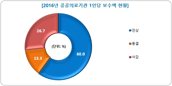 전체 의료기관의 보수액의 인상폭은 높지 않았으나 15곳 가운데 9곳(60.0%)이 인상했고, 동결 2곳(13.3%), 삭감은 4곳(26.7%)에 불과했다. 일부 병원은 적자가 수년째 지속됐으나 예산기준 보수액은 8.6% 인상을 공시했다.