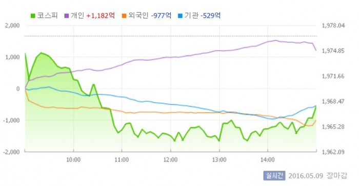 이날 코스피는 전거래일 대비 0.11% 하락한 1974.52에 장을 시작했다. 이후 지수는 외국인과 기관의 동반 매도세에 하락세를 이어갔다. 연휴 기간동안 발표된 미국 4월 고용지표가 시장 예상치를 하회하는 등 해외 지표부진이 뒤늦에 국내 증시에 영향을 준 것으로 분석된다.