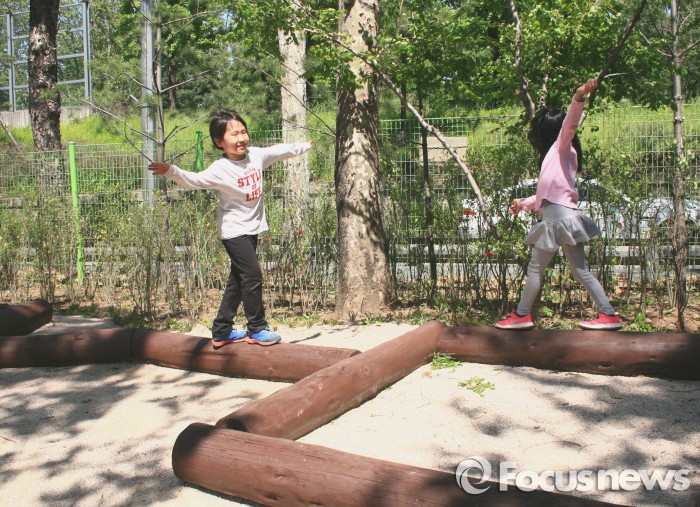 구는 생태놀이터에 △큰부리새 조합놀이대 △숲속오두막 △통나무 균형잡기 △나무 미로 △징검다리 그물 놀이대 등 10종의 목재 놀이시설을 설치했다.