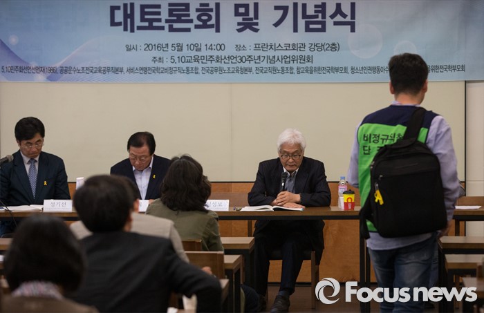 (서울=포커스뉴스) 10일 오후 서울 중구 프란치스코회관 강당에서 열린 '5.10 교육민주화선언 30주년기념 대토론회 및 기념식'에 참석한 심성보 한국교육연구네트워크 이사장이 기조발표를 하고 있다.