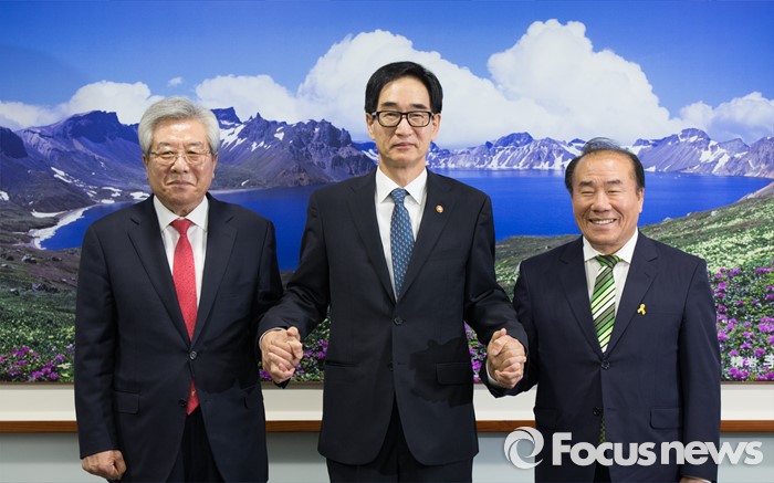(세종=포커스뉴스) 이준식 사회부총리 겸 교육부장관이 10일 오후 세종시 정부세종청사 교육부 중회의실에서 열린 전국시도교육감협의회 회장단 간담회에 참석해 장휘국(오른쪽) 광주광역시교육감, 김복만(왼쪽) 울산광역시교육감과 기념촬영 하고 있다.