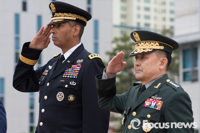 (서울=포커스뉴스) 10일 오후 서울 용산구 합동참모본부 대연병장에서 열린 환영 의장행사에서 빈센트 브룩스(왼쪽) 신임 한·미연합사령관 겸 주한미군사령관과 이순진 합참의장이 의장대 사열을 하고 있다.