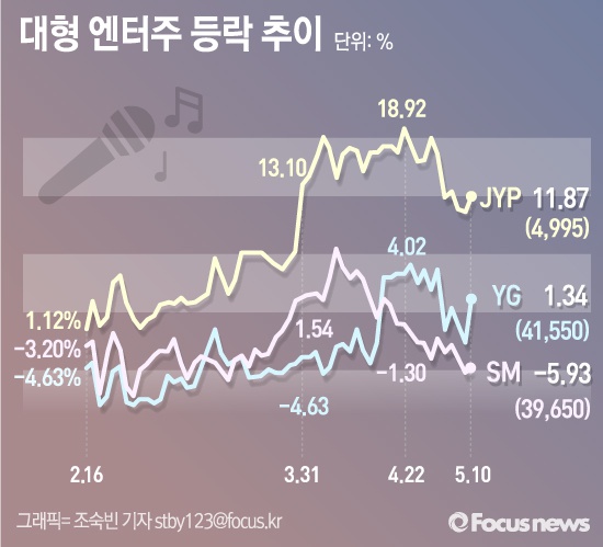 (서울=포커스뉴스) SM, YG, JYP 엔터테인먼트 등 국내 대형기획사의 주가 전망에 투자자들의 관심이 쏠리고 있지만, 실적보다 고평가 되는 부분은 유의해야 한다는 평가다.