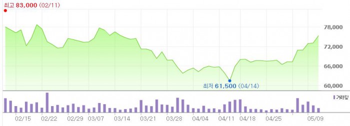 이에 따라 CJ E&M에 대한 목표주가를 종전 8만7000원에서 9만1000원으로 상향 조정했다.최근 3개월간 CJ E&M 주가 추이 <그래픽출처=네이버>