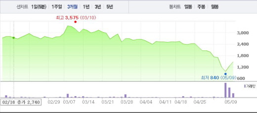 주가도 4월29일부터 이달 9일까지 5거래일 연속 하락세를 보여왔다. 4일에는 가격제한폭인 29.92%의 낙폭을 나타냈다.