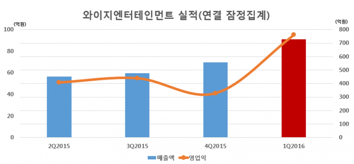 와이지엔터테인먼트는 11일 올해 1분기 연결기준 매출은 729억 5100만원으로 전년 동기 대비 64.3% 늘어난 것으로 잠정집계 됐다고 공시했다. 영업이익은 94억 8500만원으로 32.6% 증가했다.