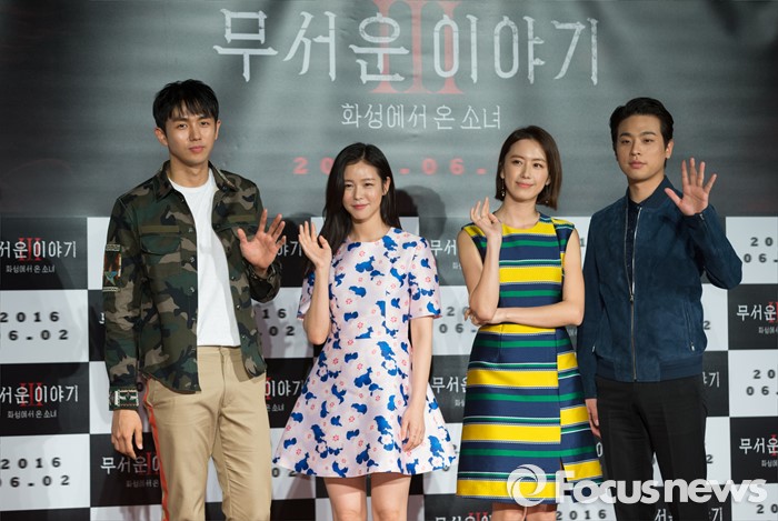 (서울=포커스뉴스) 11일 오전 서울 광진구 롯데시네마 건대입구점에서 열린 영화 '무서운이야기3' 제작보고회에 참석한 배우 임슬옹(왼쪽부터), 경수진, 홍은희, 박정민이 포토타임을 갖고 있다.