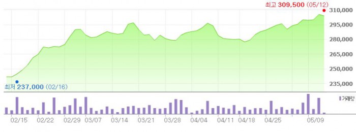 그는 "2분기 연결 매출액은 전년 동기 대비 8.1% 증가한 3691억원, 영업이익은 108% 늘어난 306억원으로 추정된다"고 전망했다.최근 3개월간 동원산업 주가 추이 <그래픽출처=네이버>