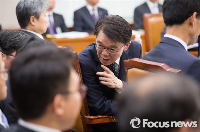 (서울=포커스뉴스) 강호인 국토교통부 장관이 12일 오전 서울 여의도 국회에서 열린 국토교통위원회 전체회의에서 국토부 관계자들과 대화하고 있다.