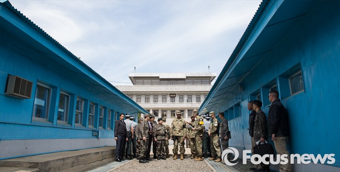 (파주=포커스뉴스) 빈센트 브룩스(오른쪽 다섯번째) 신임 한·미연합사령관 겸 주한미군사령관과 이순진(오른쪽 여섯번째) 합참의장이 12일 오후 경기도 파주시 판문점 공동경비구역(JSA)을 방문, 관계자로부터 설명을 듣고 있다.