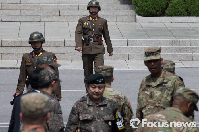 (파주=포커스뉴스) 빈센트 브룩스 신임 한·미연합사령관 겸 주한미군사령관과 이순진 합참의장이 12일 오후 경기도 파주시 판문점 공동경비구역(JSA)을 방문, 북한군 병사들이 미군과 남측 인원들을 주시하고 있다.